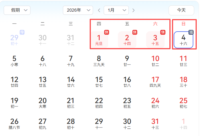 2026年1月1日(周四)— 1月3日(周六)共放假3天